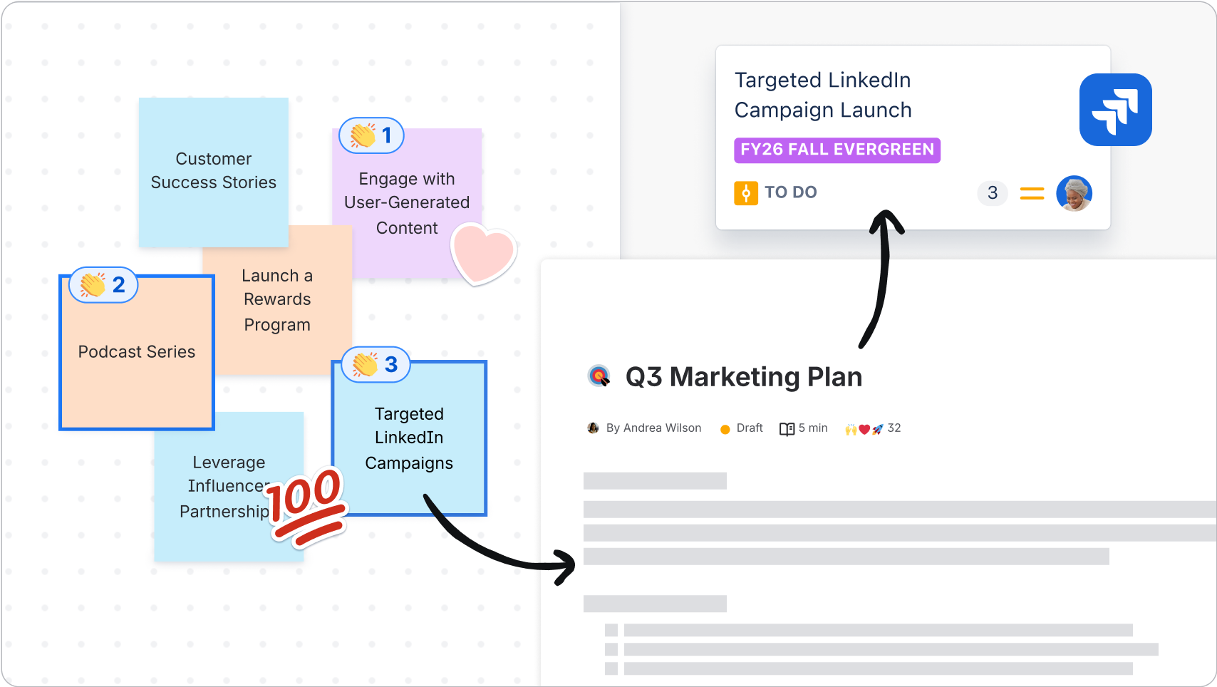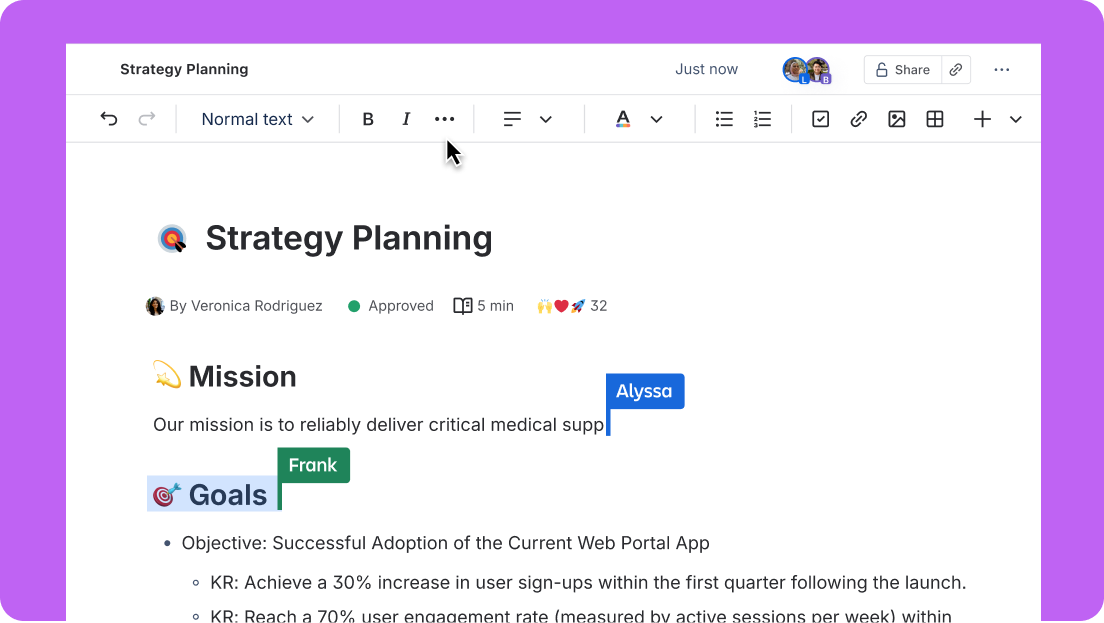 Beat the blank page with AI-powered creation and ready-to-use templates. Draft PRDs, social briefs, annual plans, and more in seconds.